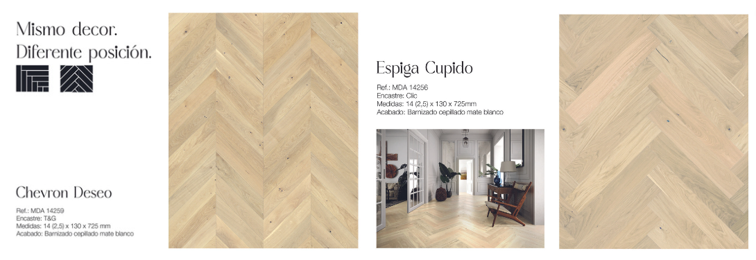 La nueva colección «Romantic Design» de Maderas de Autor ha sido cuidadosamente diseñada para capturar la esencia de la elegancia clásica. Los patrones en espiga y chevron, conocidos por su apariencia distintiva y refinada, añaden un elemento de lujo a cualquier ambiente. Ya sea que estés decorando una sala de estar, un dormitorio o incluso un espacio comercial, estos patrones atemporales se adaptarán a cualquier estilo de diseño.